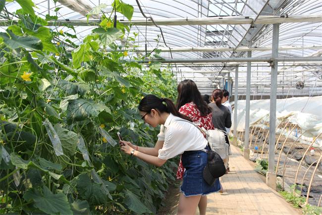 南农大(常熟)新农村发展研究院(以下简称研究院)作为国家重大农技推广服务试点工作项目的蔬菜基地,现栽种有南京农业大学自主育种的“南水2号”、“南水3号”水果黄瓜品种,津优系列黄瓜品种。由于水果黄瓜的优良口感,引起了周边农民以及部分单位的极大兴趣。2016年5月12日,董浜镇团委组织30余人到研究院基地进行参观学习,并进行水果黄瓜与樱桃番茄的采摘活动。
