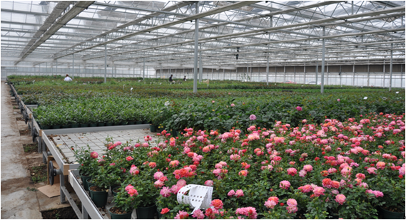 五是月季种苗培育(2个单元11520平方米),该项目由苏州市华冠园创园艺科技有限公司实施,该公司八年专注月季新品培育,收集有月季种质资源3000多种,年销售盆栽月季30万余盆,年营业额800余万元,所产月季全部通过互联网销售,是国内最大的月季种苗产销公司,2016年与世界最大月季公司-法国梅昂国际签约,成为第一个将自主培育品种销往国际市场的公司。该温室采用国内领先进的潮汐式苗床灌溉施肥系统,总投入近300万元。系统设定相关运转数据后,全部为自动化运行,无需其它人工操作。实现了定时给水与施肥,特别适合盆栽花卉的营养液栽培和容器育苗。它具有不破坏基质“三相”构成、稳定根部介质水气含量、保持叶面干燥从而减少化学药物的使用量、提高植物生长速度且成品率高、高效节约水肥达90%等优点。