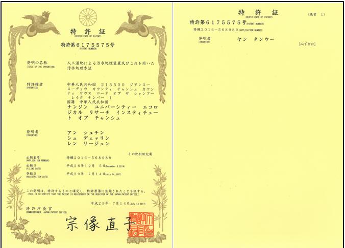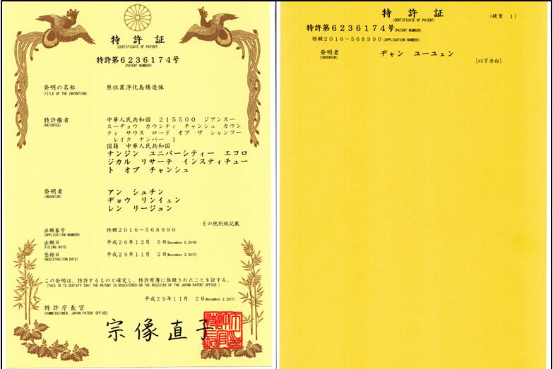 近日,南京大学常熟生态研究院(公司)收到日本专利局发来的“人工湿地污水处理装置及其处理污水的方法”(专利号6175575)、“原位净化岛结构及其构建方法”(专利号6236174)两项国际专利证书,这是公司获得的首批国际发明专利。