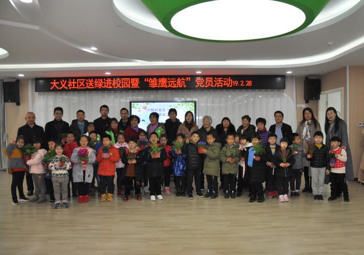 2月28日,农科园、农科所联盟支部的部分党员志愿者与共建单位大义社区的志愿者服务队共赴大义幼儿园,为幼儿园的小朋友送去了可爱的“绿色精灵”——盆栽绿植。