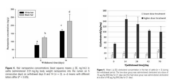 据悉,各国明确禁止β-受体激动剂(俗称“瘦肉精”)在动物生产中使用,但“瘦肉精”(例如盐酸克伦特罗、莱克多巴胺)引发的食品安全问题仍有发生。在政府部门监管过程中,通常将尿液和血液样品作为监管靶标,但对于反刍动物(牛、羊)来说,尿液和血液样品不易获得。研究发现,毛发作为另外一种活体样品,采样更为方便,样品容易保存,且毛发代谢慢,残留时间长。盐酸克伦特罗在毛发中的残留量与毛发颜色和剂量都有相关性,颜色越深或剂量越高,残留量越高;盐酸克伦特罗在肉牛白色毛发中的残留时间能达到70天,而在红色毛发中残留的时间更长。与盐酸克伦特罗相比,莱克多巴胺在毛发中的蓄积能力较弱,但连续给牛投喂莱克多巴胺5天后,再停药14天,血浆中莱克多巴胺含量低于检测限,尿液中含量仅为8.3微克/千克时,而黑、白毛发中的残留量则分别高达226.7、165.6微克/千克。
