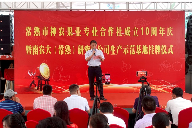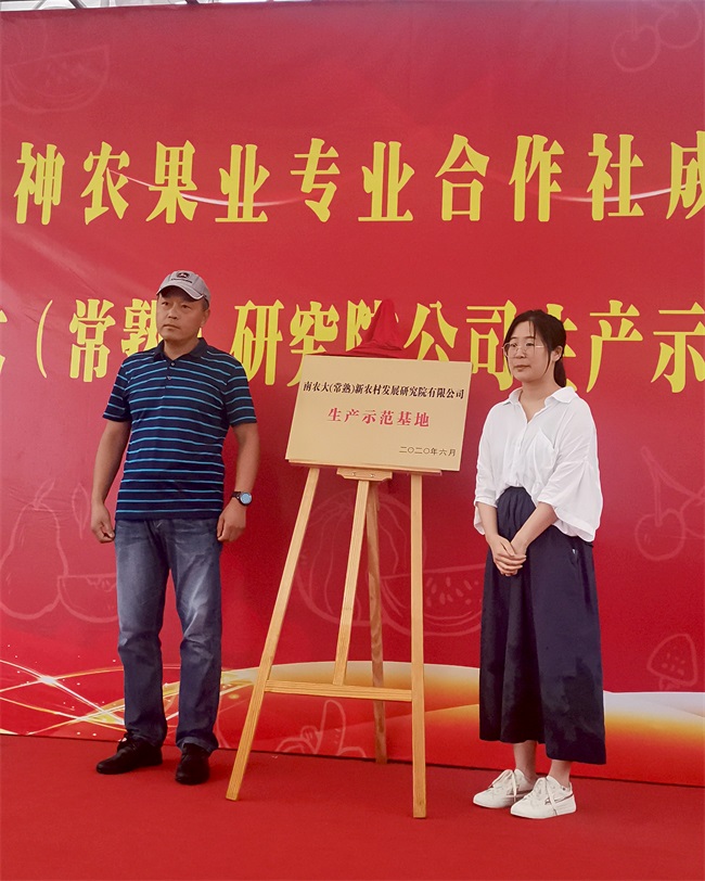 南农大(常熟)研究院公司董事长兼总经理殷峰和神农果业合作社总经理任秋逸共同为生产示范基地揭牌。
