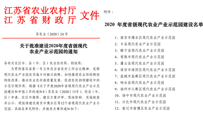 近日,江苏省农业农村厅、财政厅联合发文《关于批准建设2020年度省级现代农业产业示范园的通知》(苏农业〔2020〕24号),文件明确批准12个省级现代农业产业示范园建设。其中常熟市现代农业产业示范园名列其中,标志着由园区主导的省级现代农业产业示范园创建成功获批。