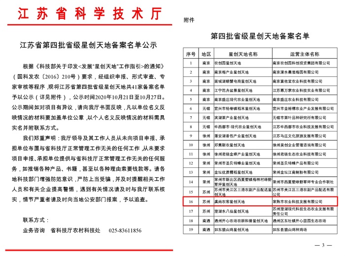 近日,江苏省科学技术厅发出公示文件,文件确定了江苏常熟国家农业科技园区管委会市场化运作平台——常熟市农业科技发展有限公司为运营主体的虞尚农客星创天地通过公示,获批为江苏省第四批省级星创天地。