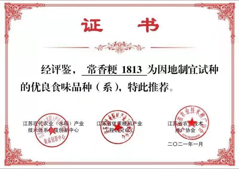 常香粳1813于2020年通过江苏省审定,属早熟晚粳稻品种,食味品质优,抗病性好,丰产性稳定,平均亩产723.6 公斤,高产田块亩产达807.4公斤。常香粳1813是园区重点科研单位市农科所继早香粳1号之后育成的又一个软香米品种,2020年度在省内各示范点表现突出,受到了种植农户和稻米加工企业的一致好评,已被列为2021年度苏州市水稻主推品种。
