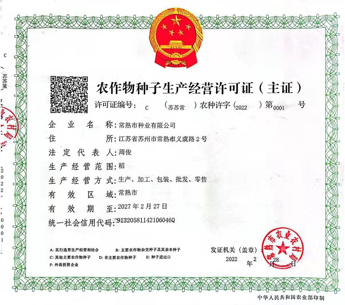 农业现代化,种子是基础。种子作为农业生产的根本,对加快推进农业高质量发展具有重大的战略意义。在市农业农村局及市种子管理站领导的密切关心下,按照农业部《农作物种子生产经营许可管理办法》的规定,常熟市种业有限公司于2月28日取得农作物种子生产经营许可证,实现了从借资质、品种代理到拥有品种权、自主经营。这是我市颁发的首张,也是苏州地区唯一的国有企业种子生产经营许可证。