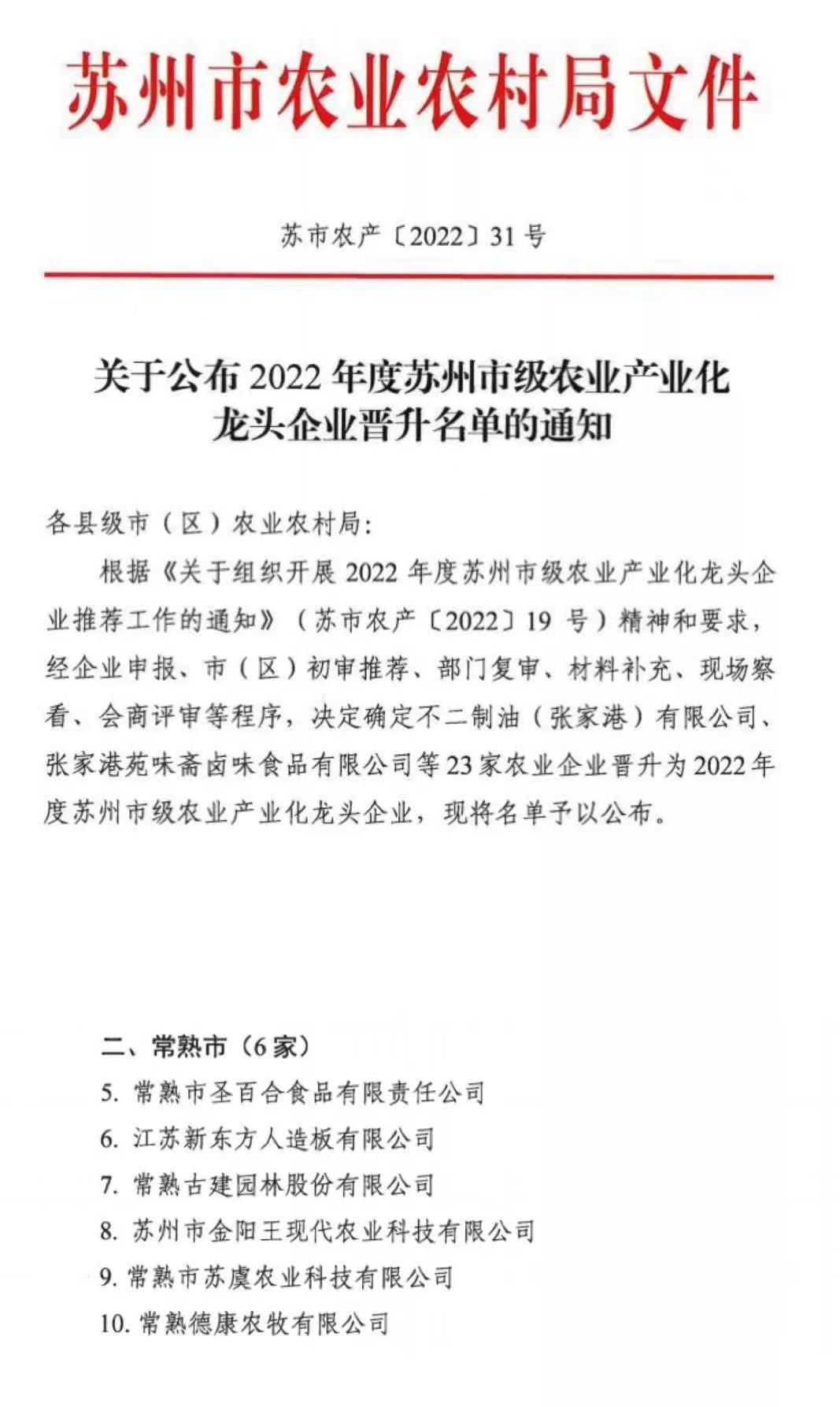 近日,苏州市农业农村局公布了2022年度苏州市级农业产业化龙头企业晋升名单,江苏常熟国家农业科技园区新增6家,分别是常熟市圣百合食品有限责任公司、江苏新东方人造板有限公司、常熟古建园林股份有限公司、苏州市金阳王现代农业科技有限公司、常熟市苏虞农业科技有限公司、常熟德康农牧有限公司。截至目前,园区拥有苏州市级以上农业龙头企业43家。
