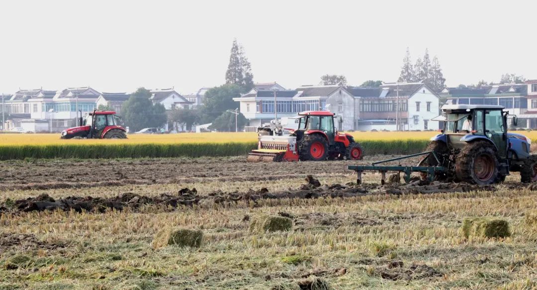 在园区海虞镇徐桥村的秋收现场,无人收割机按照设定程序自动收割着水稻。秸秆收集扎捆机开足马力,将田间秸秆收割捆扎成长方体状的秸秆团后,从机器的另一侧吐出。深松机驰骋在秋收后的土地上,留下一条条整齐的垄沟,一派丰收景象。