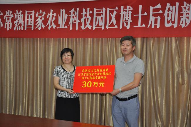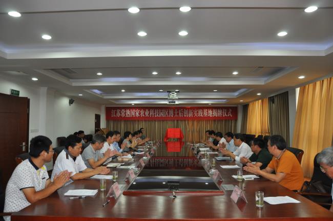 揭牌仪式首先由园区管委会副主任张颂跃介绍了常熟国家农业科技园区发展情况和博士后创新实践基地的建设情况。在欢快的音乐声中,省人社厅副厅长朱从明、市委常委、市政府常务副市长沈晓东,苏州人社局局长程华国、常熟市组织部副部长、市人社局局长廖瑞娟先后给园区博士后创新实践基地及三个分站揭牌。市人社局局长廖瑞娟先后给园区博士后创新实践基地及农科所分站颁发了30万元和15万元的奖金。
