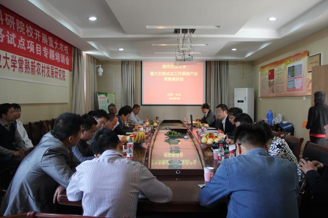 4月19日,南京农业大学重大农推试点工作(以下简称“项目”)果蔬产业常熟推进会在南农大(常熟)研究院召开。南农大新农村发展研究院办公室主任陈巍、常熟市农委主任陆益、南农大园艺学院副院长吴巨友、南农大新农村发展研究院副科长王克其、南农大园艺学院副教授钱春桃、《农民日报》记者李文博以及常熟新型主体联盟代表等出席会议,会议由常熟国家现代农业园区主任王志丰主持。