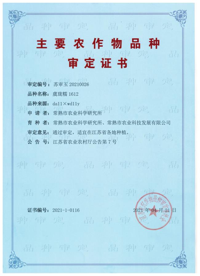 2021年3月17日,江苏省农作物品种审定委员会在南京召开第七十次主要农作物品种审定会议,会议审定通过了151个主要农作物品种。由常熟市农业科学研究所、常熟市农业科技发展有限公司共同选育的糯玉米新品种“虞珑糯1612”名列其中,并于4月份经江苏省农业农村厅正式公告发布。虞珑糯1612的成功选育填补了我市除水稻品种外其它农作物新品种选育研究领域的空白。