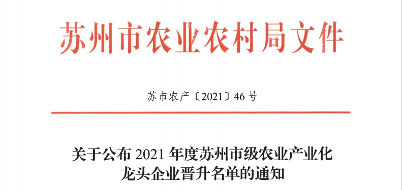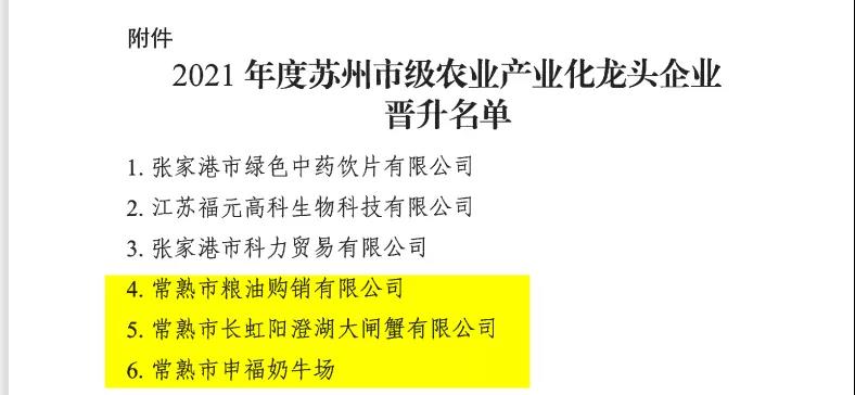 近日,苏州市农业农村局公布了2021年度苏州市级农业产业化龙头企业晋升名单,新增19家苏州市级农业产业化龙头企业。园区三家企业成功晋升,分别是常熟市粮油购销有限公司、常熟市长虹阳澄湖大闸蟹有限公司、常熟市申福奶牛场。