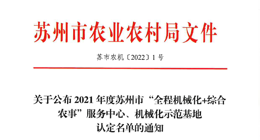 2月23日,苏州市农业农村局公布了2021年度市级“全程机械化+综合农事”服务中心、机械化示范基地认定名单,园区农发公司获得机械化(蔬菜)示范基地认定。