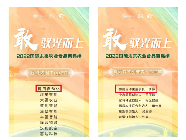 2022年12月16日-17日,在陕西杨凌举办的2022国际未来农业食品百强·杨凌峰会上,江苏常熟国家农业科技园区引入的苏州博田自动化技术有限公司名列“35斗”《2022国际未来农业食品百强榜》智能装备Top20榜首,董事长李伟教授入围优秀女性创业者·木兰奖,名列榜首。