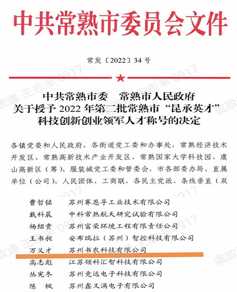 习近平总书记指出:“农业现代化,关键是农业科技现代化。”近年来,常熟国家农业科技园区围绕现代农业数字化、智能化转型,聚焦智慧农业全产业链技术革新,依托园区“虞尚农客”星创天地等创业创新平台,引进、培育、孵化了如苏州书农科技有限公司(公司法人荣获2022年第二批常熟市“昆承英才”科技创新创业领军人才)、农耕五祖(苏州)农业科技有限公司、长育生物科技有限公司等一