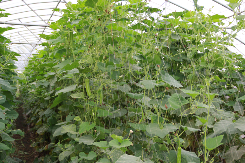 随后,钱春桃一行在张兴洪的带领下,参观了种植基地并进行现场指导。钱春桃指出,番茄矮化密植栽培,相比传统栽培可节省用药、追肥、灌水50%以上,缩短生长期30-45天,并且果个大而整齐,产量高,收获期集中,要注意合理密植,加强整枝,主攻两穗果。大棚丝瓜矮化密植栽培技术能有效提高丝瓜的品质和商品性,植株调整时摘除所有侧蔓和卷须,保留丝瓜主蔓至22-26节后摘心留瓜,使养分集中供应嫩瓜生长然后保留一根侧蔓,进行第2次结瓜 。结瓜后保留两节再打顶,如此往复。传统藤本蔬菜作物如西葫芦、长豇豆等,在栽培时需要较多的架材、人工,结合现有栽培技术,实行网架栽培能大大减少用工量,节省架材成本,具有很明显的优势。